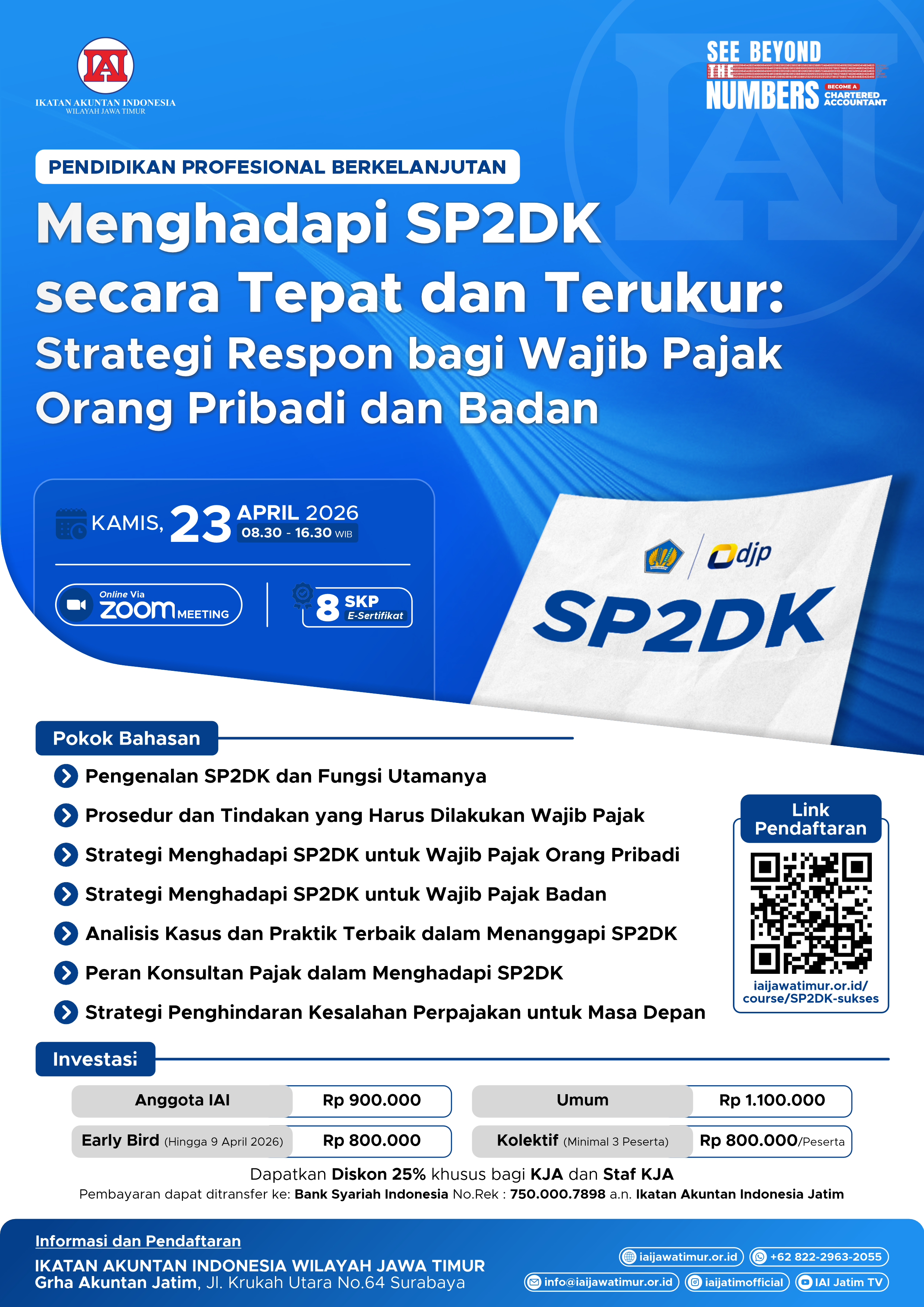Meningkatnya intensitas pengawasan serta semakin ketatnya regulasi perpajakan di Indonesia, Wajib Pajak (WP) baik Orang Pribadi (OP) maupun Badan kerap dihadapkan pada SP2DK (Surat Permintaan Penjelasan atas Data dan/atau Keterangan) yang diterbitkan oleh Direktorat Jenderal Pajak (DJP) sebagai bentuk permintaan klarifikasi, karena adanya ketidaksesuaian/ gap antara pelaporan perpajakan yang disampaikan WP dengan data pembanding yang dimiliki DJP. SP2DK berfungsi sebagai mekanisme klarifikasi dan pengendalian untuk meningkatkan kepatuhan serta meminimalkan risiko penghindaran pajak yang dapat berdampak pada penerimaan negara. Wajib Pajak mungkin mengalami kesulitan dalam memahami dan merespons SP2DK dengan tepat. Oleh karena itu, penting bagi setiap WP untuk memahami secara mendalam bagaimana strategi respon/ cara menghadapi SP2DK, baik dari perspektif WPOP maupun Badan. Hal ini bertujuan agar WP dapat memberikan klarifikasi atau pembenaran yang tepat sesuai ketentuan perpajakan, menghindari potensi sanksi, serta mempercepat proses penyelesaian sengketa pajak.