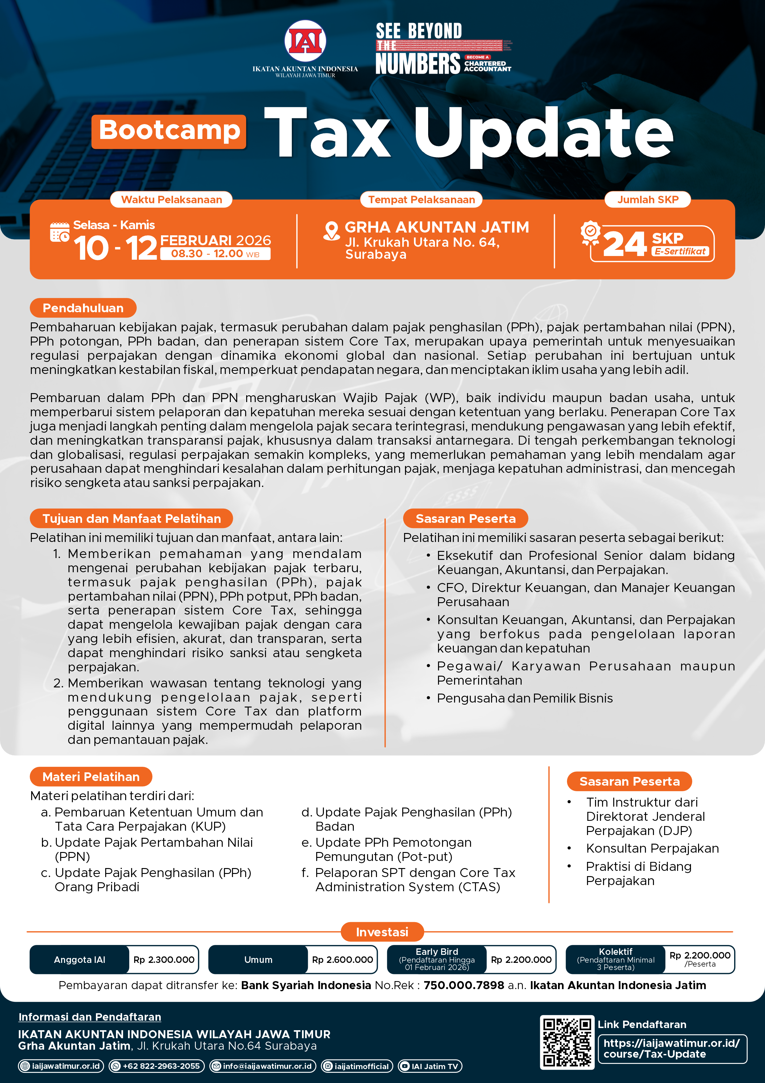 Pembaruan dalam PPh dan PPN mengharuskan Wajib Pajak (WP), baik individu maupun badan usaha, untuk memperbarui sistem pelaporan dan kepatuhan mereka sesuai dengan ketentuan yang berlaku. Penerapan Core Tax juga menjadi langkah penting dalam mengelola pajak secara terintegrasi, mendukung pengawasan yang lebih efektif, dan meningkatkan transparansi pajak, khususnya dalam transaksi antarnegara. Di tengah perkembangan teknologi dan globalisasi, regulasi perpajakan semakin kompleks, yang memerlukan pemahaman yang lebih mendalam agar perusahaan dapat menghindari kesalahan dalam perhitungan pajak, menjaga kepatuhan administrasi, dan mencegah risiko sengketa atau sanksi perpajakan.