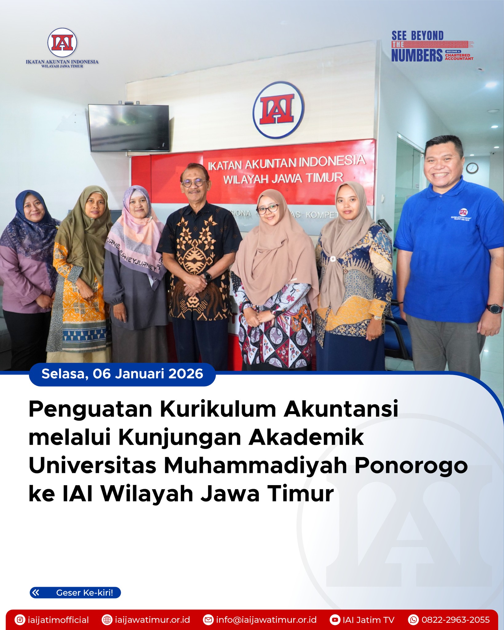 Ikatan Akuntan Indonesia Wilayah Jawa Timur menerima kunjungan dari Program Studi D3 Akuntansi dan S1 Akuntansi Fakultas Ekonomi Universitas Muhammadiyah Ponorogo dalam rangka permohonan review kurikulum. Kegiatan ini dilaksanakan di Grha Akuntan Jawa Timur, Surabaya, sebagai wujud sinergi antara perguruan tinggi dan organisasi profesi akuntan dalam meningkatkan mutu pendidikan akuntansi.