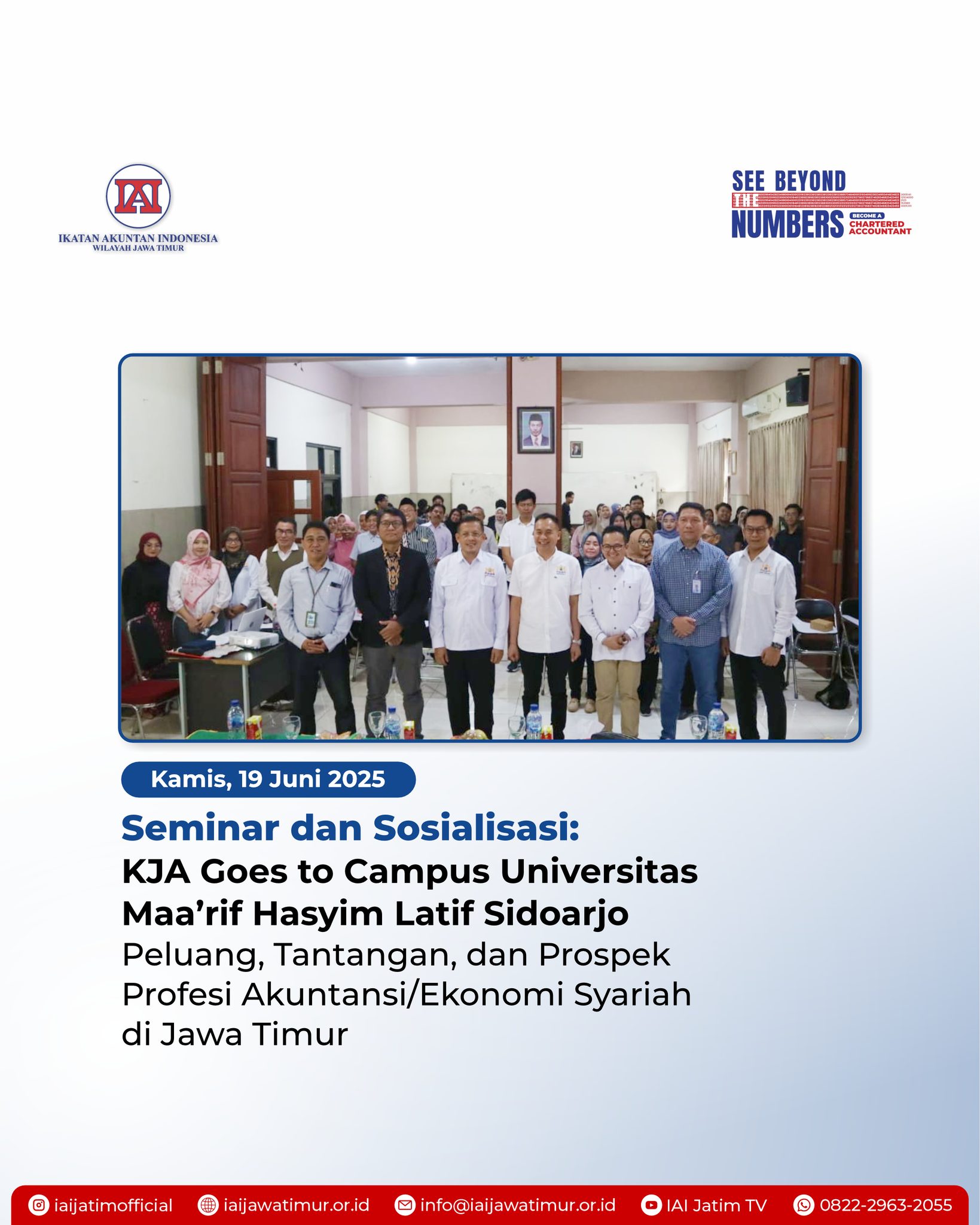 Sidoarjo, 19 Juni 2025 — Ikatan Akuntan Indonesia (IAI) Wilayah Jawa Timur melalui Bidang Akuntan Kantor Jasa Akuntan (KJA) turut berpartisipasi dalam kegiatan KJA Goes to Campus yang diselenggarakan oleh Fakultas Ekonomi dan Bisnis Universitas Maarif Hasyim Latif (UMAHA). Seminar ini mengangkat tema “Peluang, Tantangan, dan Prospek Profesi Akuntansi/Ekonomi Syariah di Jawa Timur”.