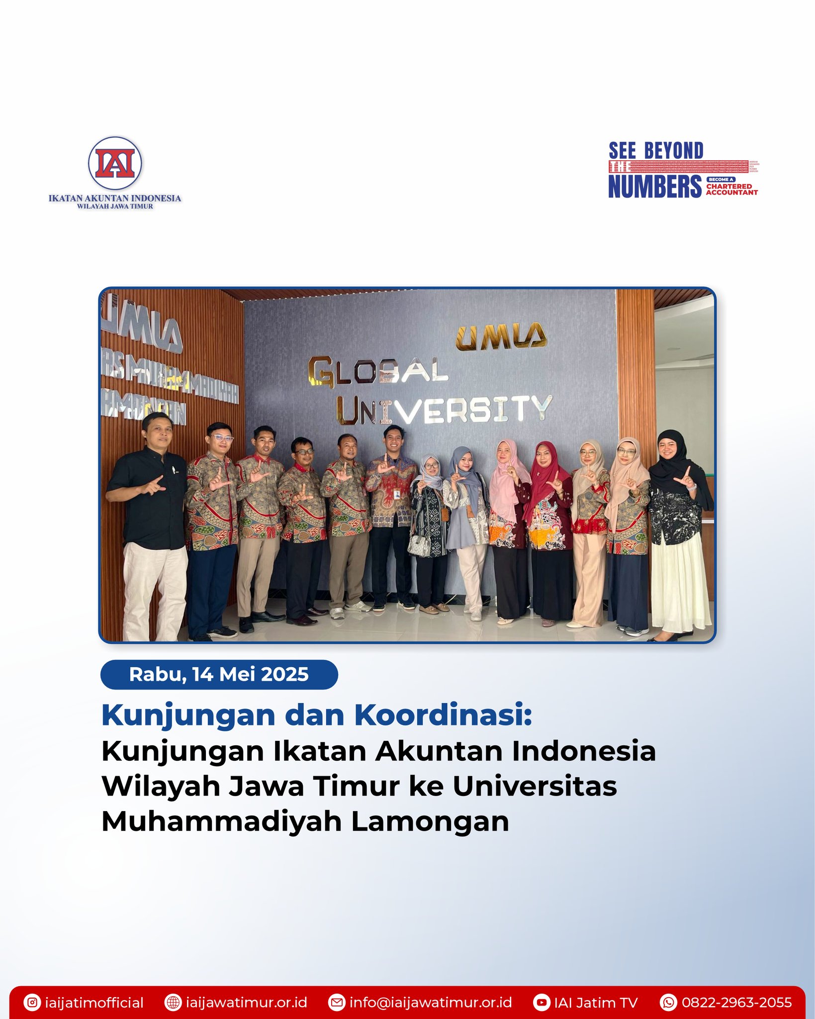 Lamongan, 14 Mei 2025 - Manajemen Eksekutif Ikatan Akuntan Indonesia (IAI) Wilayah Jawa Timur melakukan kunjungan dan koordinasi ke Universitas Muhammadiyah Lamongan (UMLA). Kegiatan ini berlangsung di ruang rapat gedung rektorat UMLA dan bertujuan untuk memperkuat kolaborasi di bidang akademik, pelatihan profesional, serta pengembangan kompetensi akuntansi di lingkungan universitas.