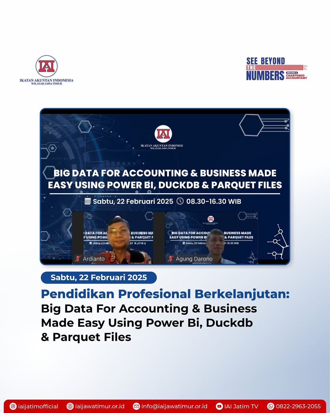 Sabtu, 22 Februari 2025 - Ikatan Akuntan Indonesia (IAI) Wilayah Jawa Timur sukses menggelar Pendidikan Profesional Berkelanjutan (PPL) bertema "Big Data for Accounting & Business Made Easy Using Power BI, DuckDB & Parquet Files" pada Sabtu, 22 Februari 2025. Kegiatan ini dilaksanakan secara online melalui Zoom Meeting dan diikuti oleh praktisi, auditor, akademisi, konsultan, serta masyarakat umum yang ingin memahami pemanfaatan big data dalam akuntansi dan bisnis modern.