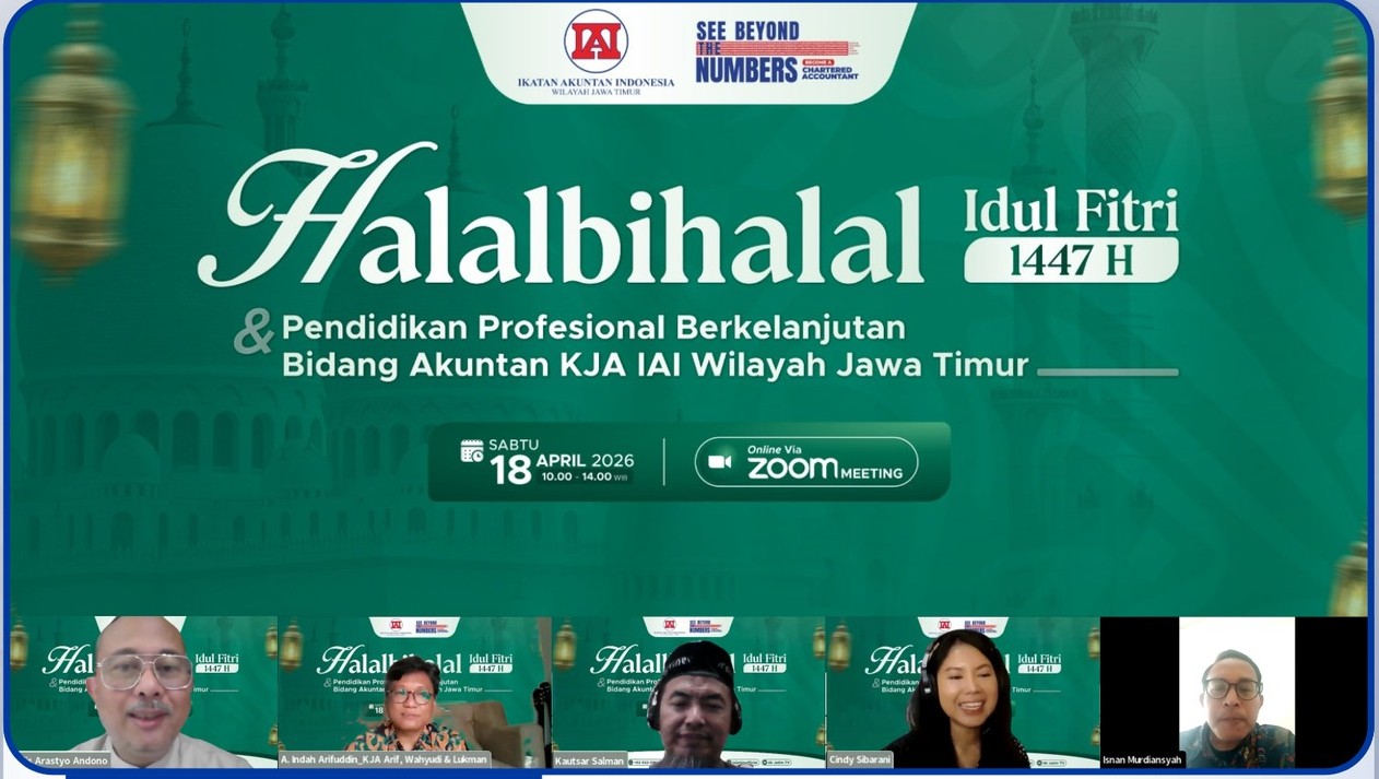 Surabaya – Ikatan Akuntan Indonesia (IAI) Wilayah Jawa Timur melalui Bidang Akuntan Kantor Jasa Akuntansi (KJA) sukses menyelenggarakan kegiatan Halalbihalal dan Pendidikan Profesional Berkelanjutan (PPL) secara daring pada Sabtu (18/04). Kegiatan yang berlangsung melalui platform Zoom Meeting ini diikuti oleh 54 peserta yang terdiri dari para pimpinan KJA beserta staf dari berbagai daerah di Jawa Timur.