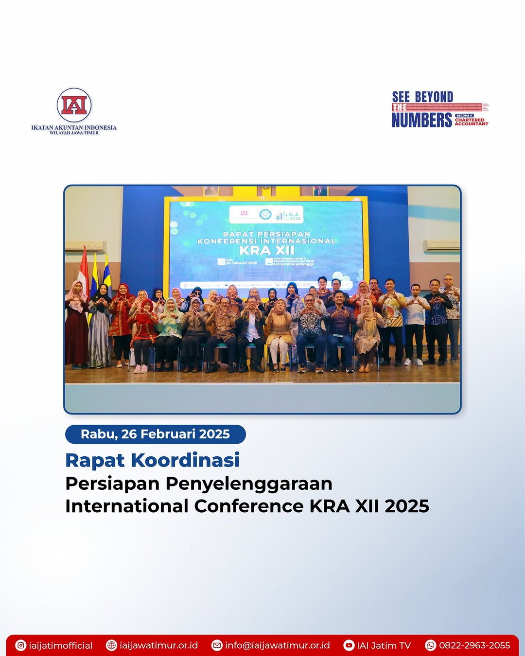 Rabu, 26 Februari 2025 - Ikatan Akuntan Indonesia (IAI) Kompartemen Akuntan Pendidik (KAPd) bekerja sama dengan Fakultas Ekonomi dan Bisnis (FEB) Universitas Airlangga (UNAIR) menggelar Rapat Persiapan Konferensi Internasional KRA XII Tahun 2025 di Aula Soepoyo, Lantai 3, FEB Universitas Airlangga. Rapat ini dihadiri oleh Panitia Inti dan Co-Host sebagai langkah strategis untuk memastikan kelancaran penyelenggaraan konferensi.