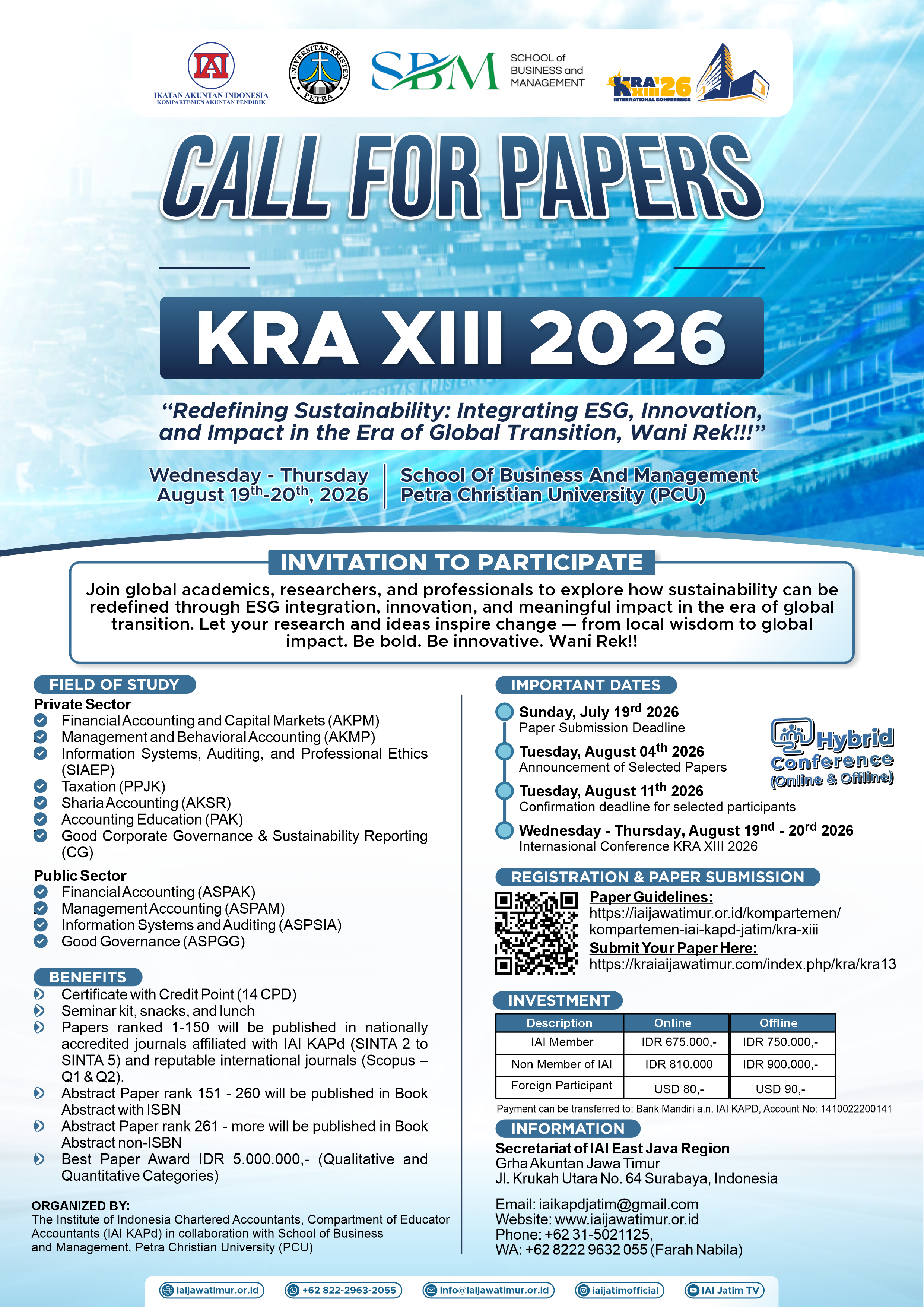 Melalui konferensi ini, IAI KAPd dan Universitas Kristen Petra serta didukung oleh 53 Co Host berkomitmen untuk terus mendorong transformasi pendidikan akuntansi di Indonesia agar tetap relevan dan memiliki kredibilitas global. Informasi lengkap mengenai panduan penulisan makalah dan pendaftaran dapat diakses melalui situs resmi IAI Wilayah Jawa Timur.