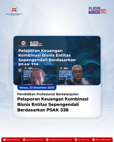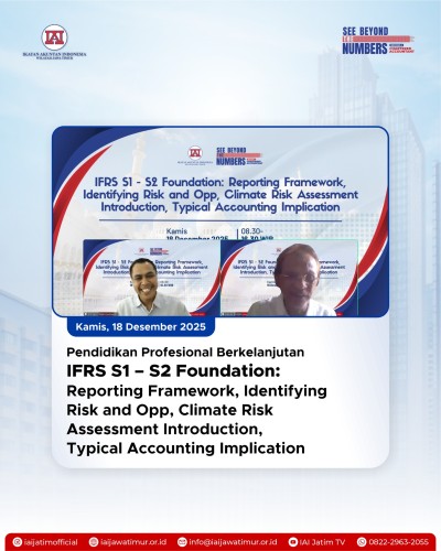 Ikatan Akuntan Indonesia (IAI) Wilayah Jawa Timur menyelenggarakan Pendidikan Profesional Berkelanjutan (PPL) bertema “IFRS S1–S2 Foundation” secara daring melalui Zoom Meeting pada Kamis, 18 Desember 2025. Kegiatan yang berlangsung pukul 08.30–...