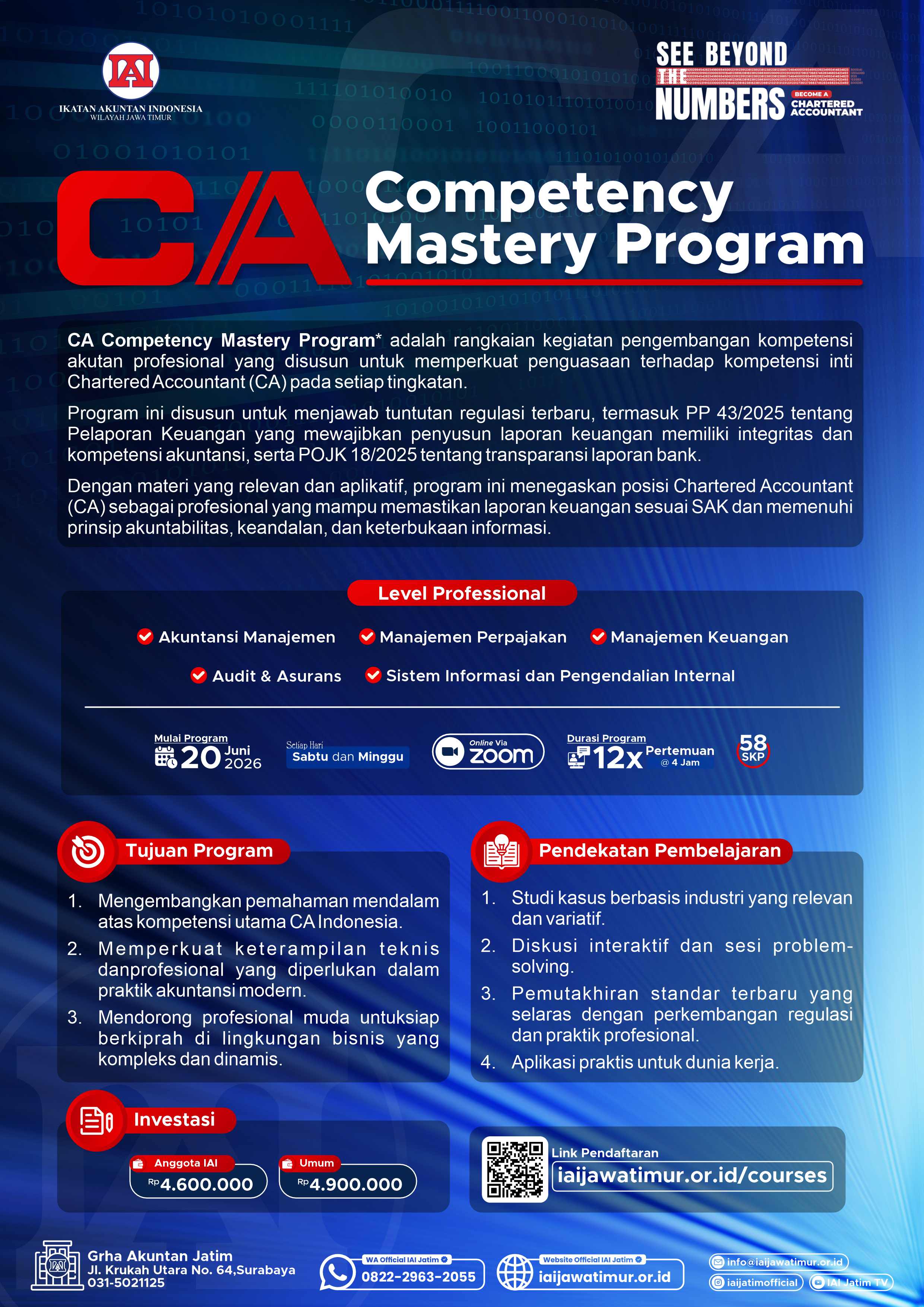 CA Competency Mastery Program adalah rangkaian kegiatan pengembangan kompetensi akuntan profesional yang disusun untuk memperkuat penguasaan terhadap kompetensi inti Chartered Accountant (CA) pada setiap tingkatan. Program ini disusun untuk menjawab tuntutan regulasi terbaru, termasuk PP 43/2025 tentang Pelaporan Keuangan yang mewajibkan penyusun laporan keuangan memiliki integritas dan kompetensi akuntansi, serta POJK 18/2025 tentang transparansi laporan bank. Dengan materi yang relevan dan aplikatif, program ini menegaskan posisi Chartered Accountant (CA) sebagai profesional yang mampu memastikan laporan keuangan sesuai SAK dan memenuhi prinsip akuntabilitas, keandalan, dan keterbukaan informasi.