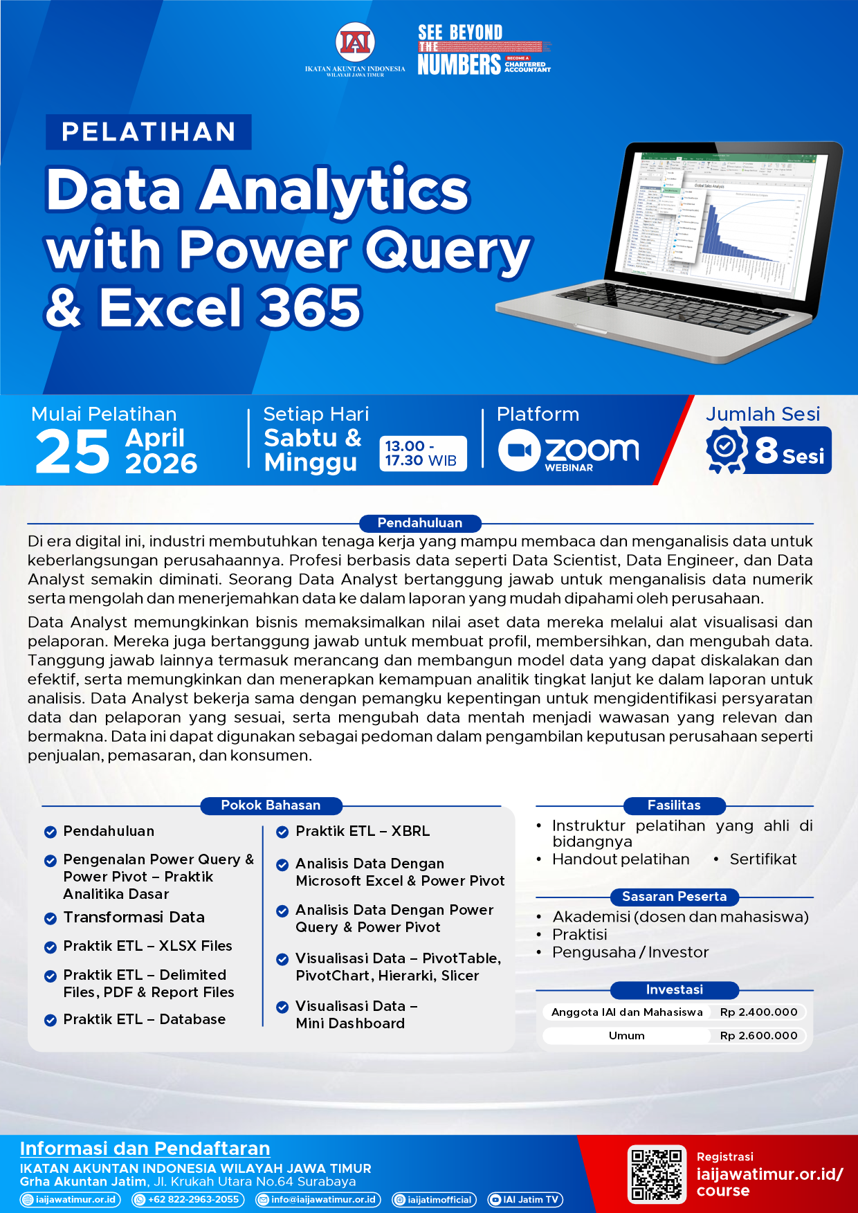 Di era digital ini, industri membutuhkan tenaga kerja yang mampu membaca dan menganalisis data untuk keberlangsungan perusahaannya. Profesi berbasis data seperti Data Scientist, Data Engineer, dan Data Analyst semakin diminati. Seorang Data Analyst bertanggung jawab untuk menganalisis data numerik serta mengolah dan menerjemahkan data ke dalam laporan yang mudah dipahami oleh perusahaan.