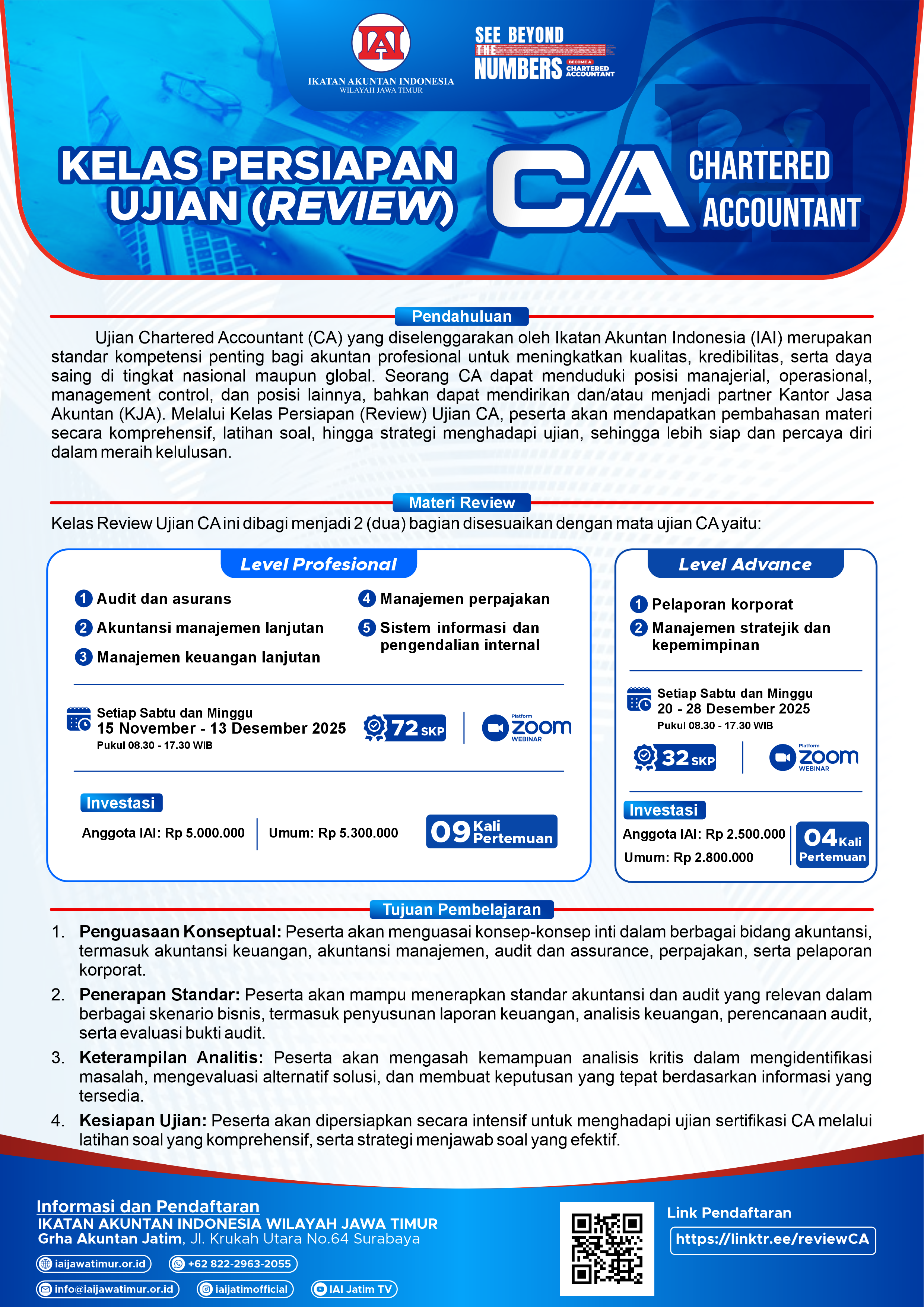 Ujian Chartered Accountant (CA) yang diselenggarakan oleh Ikatan Akuntan Indonesia (IAI) merupakan standar kompetensi penting bagi akuntan profesional untuk meningkatkan kualitas, kredibilitas, serta daya saing di tingkat nasional maupun global. Seorang CA dapat menduduki posisi manajerial, operasional, management control, dan posisi lainnya, bahkan dapat mendirikan dan/atau menjadi partner Kantor Jasa Akuntan (KJA). Melalui Kelas Persiapan (Review) Ujian CA, peserta akan mendapatkan pembahasan materi secara komprehensif, latihan soal, hingga strategi menghadapi ujian, sehingga lebih siap dan percaya diri dalam meraih kelulusan.
