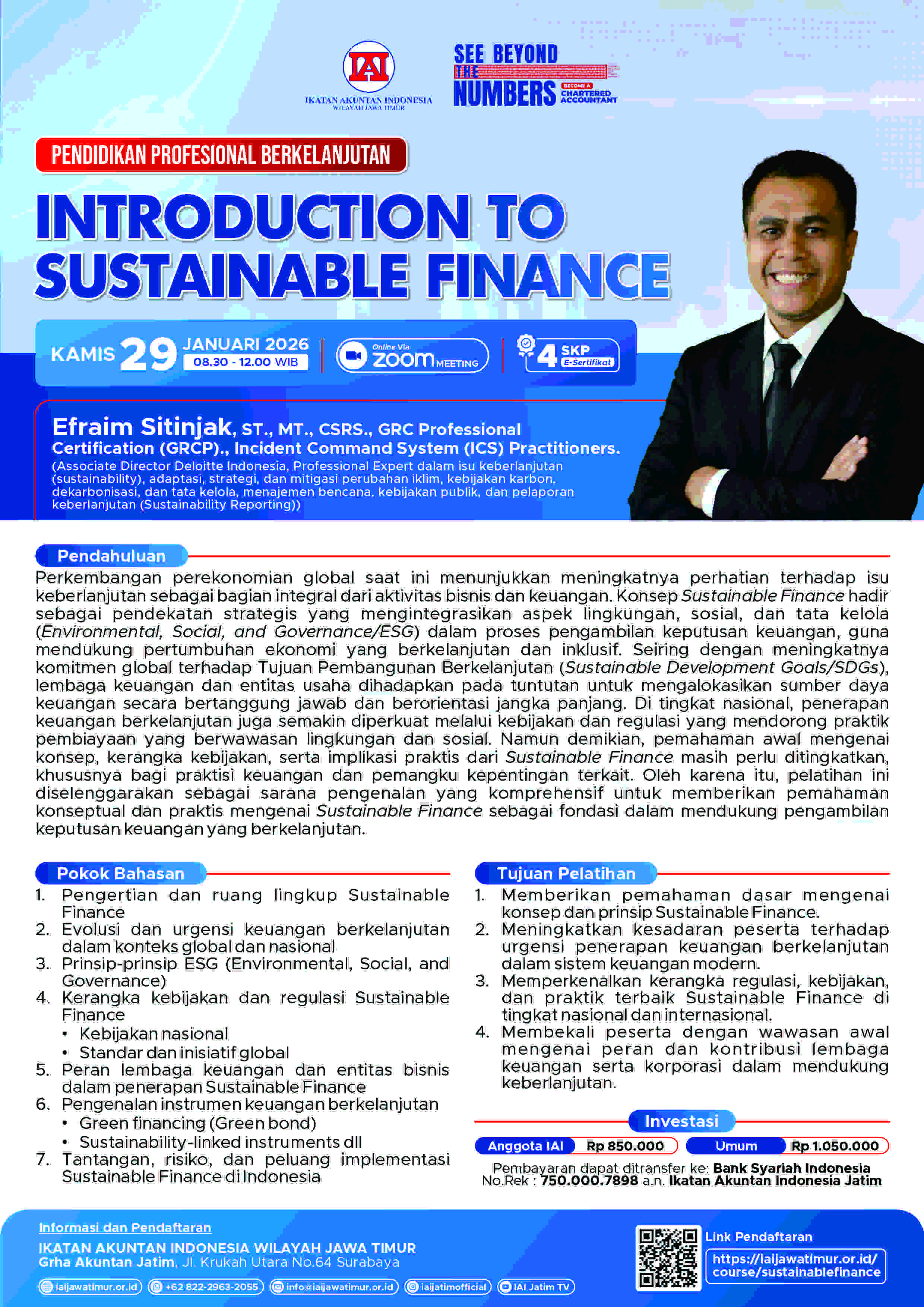 Perkembangan perekonomian global saat ini menunjukkan meningkatnya perhatian terhadap isu keberlanjutan sebagai bagian integral dari aktivitas bisnis dan keuangan. Konsep Sustainable Finance hadir sebagai pendekatan strategis yang mengintegrasikan aspek lingkungan, sosial, dan tata kelola (Environmental, Social, and Governance/ESG) dalam proses pengambilan keputusan keuangan, guna mendukung pertumbuhan ekonomi yang berkelanjutan dan inklusif. Seiring dengan meningkatnya komitmen global terhadap Tujuan Pembangunan Berkelanjutan (Sustainable Development Goals/SDGs), lembaga keuangan dan entitas usaha dihadapkan pada tuntutan untuk mengalokasikan sumber daya keuangan secara bertanggung jawab dan berorientasi jangka panjang. Di tingkat nasional, penerapan keuangan berkelanjutan juga semakin diperkuat melalui kebijakan dan regulasi yang mendorong praktik pembiayaan yang berwawasan lingkungan dan sosial. Namun demikian, pemahaman awal mengenai konsep, kerangka kebijakan, serta implikasi praktis dari Sustainable Finance masih perlu ditingkatkan, khususnya bagi praktisi keuangan dan pemangku kepentingan terkait. Oleh karena itu, pelatihan ini diselenggarakan sebagai sarana pengenalan yang komprehensif untuk memberikan pemahaman konseptual dan praktis mengenai Sustainable Finance sebagai fondasi dalam mendukung pengambilan keputusan keuangan yang berkelanjutan.