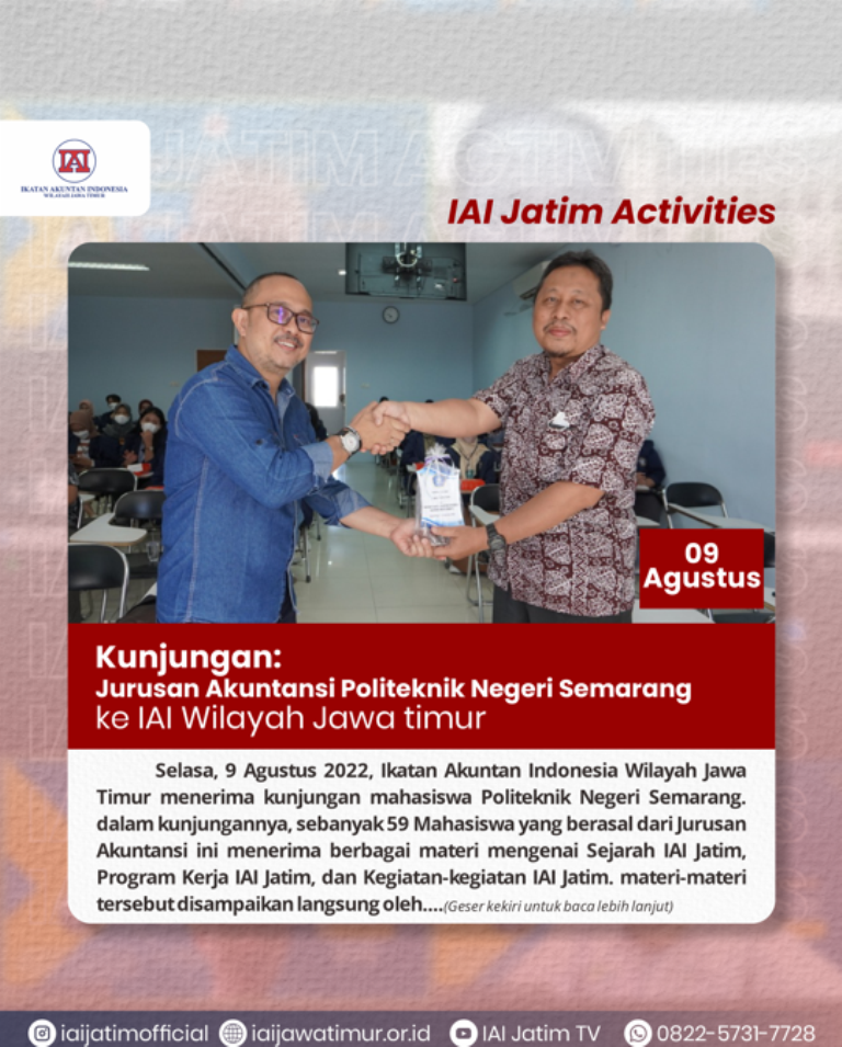 Selasa, 9 Agustus 2022, Ikatan Akuntan Indonesia Wilayah Jawa Timur menerima kunjungan mahasiswa Politeknik Negeri Semarang. dalam kunjungannya, sebanyak 59 Mahasiswa yang berasal dari Jurusan Akuntansi ini menerima berbagai materi mengenai Sejarah IAI Jatim, Program Kerja IAI Jatim, dan Kegiatan-kegiatan IAI Jatim. materi-materi tersebut disampaikan langsung oleh Ketua bidang Pengurus IAI Jatim Bidang Pengembangan, Pengabdian Masyarakat, & Hubungan Masyarakat, Fidelis Arastyo Andono S.E., Ak., M.M., Ph.D.,