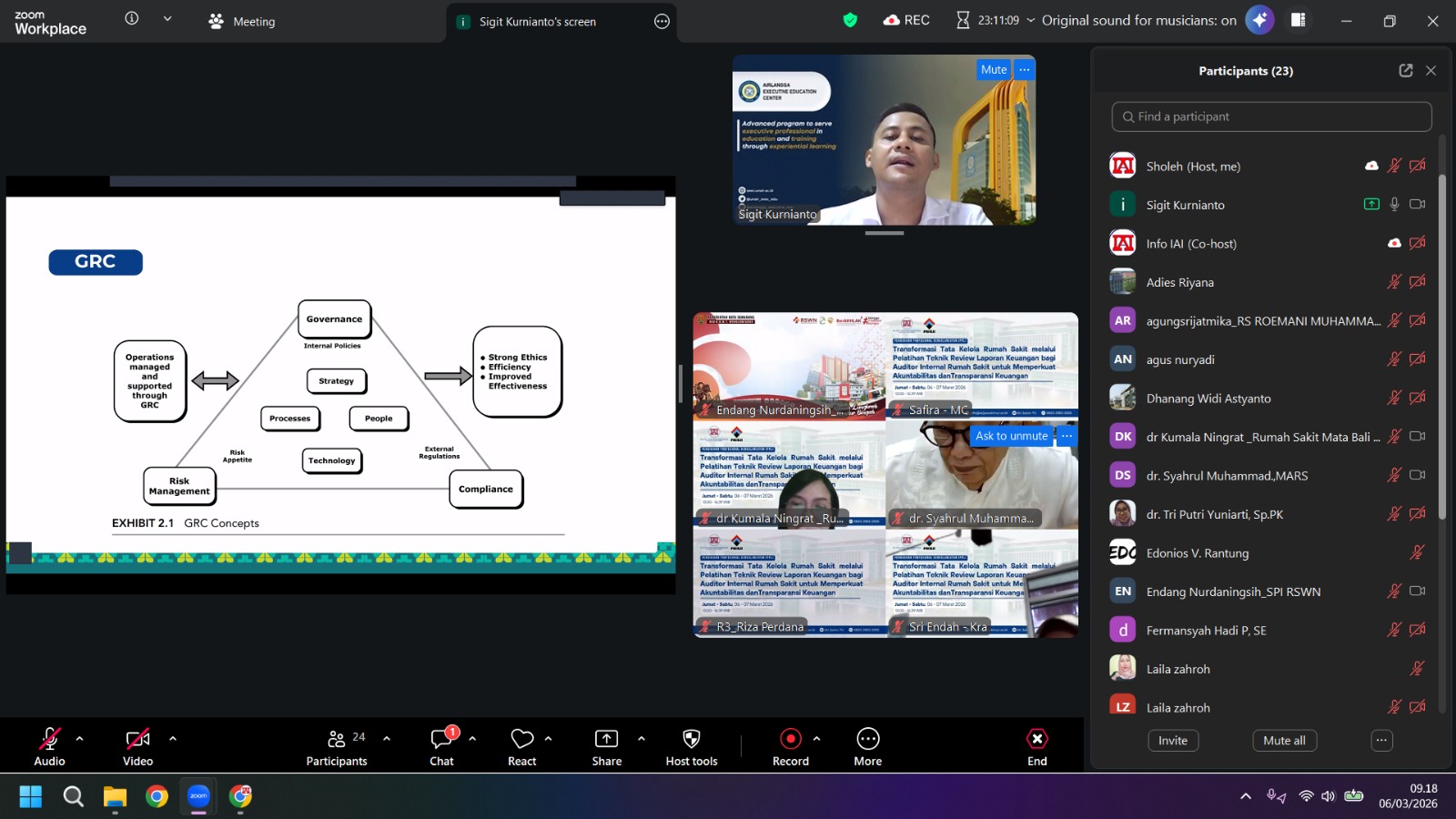 Materi kemudian berlanjut pada pembahasan mengenai pendekatan berbasis risiko dalam proses review. Dr. Sigit memaparkan bahwa auditor internal harus mampu mengidentifikasi area-area dengan risiko salah saji material yang tinggi di rumah sakit, seperti pengelolaan persediaan farmasi, pendapatan layanan pasien, hingga beban operasional. Dengan memahami profil risiko ini, proses review dapat dilakukan secara lebih efektif dan efisien sesuai dengan skala prioritas yang ada.